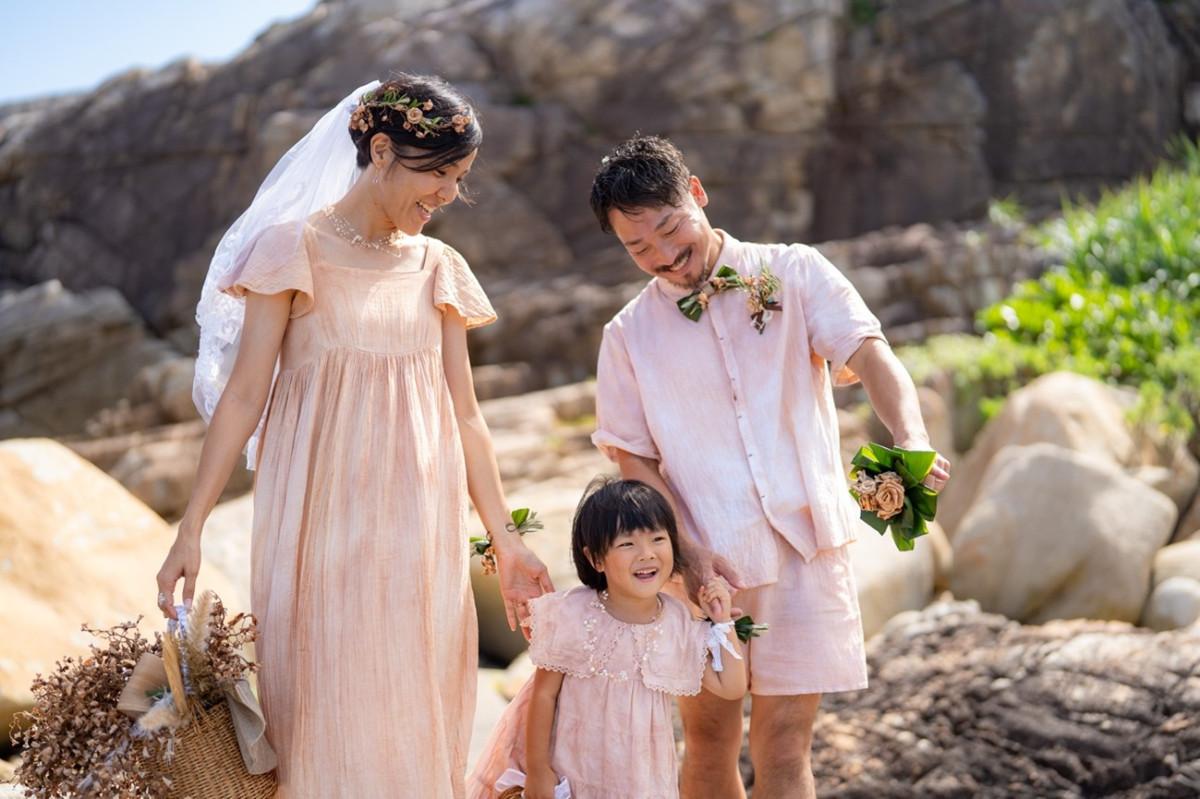 徳之島の弁当販売店「ネリヤカナ屋」(徳之島町亀津)が展開する月桃染めの衣料ブランド「月桃獅子徳之島」のウエディング衣装が10月19日、島内で行われたフォトウエディングに初めて貸し出された。