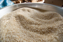沖永良部島和泊町の国頭字に住む橋口盛一さんが9月29日、自身の倉庫で今年収穫した米を精米した。もみを精米機にかけ、仕上げ後はざるに移して風にさらし、ちりを飛ばすまでの工程を行った。途中で、橋口さんに米作りを学ぶ葉棚清二さんもドリンクとバナナを手に駆けつけた。