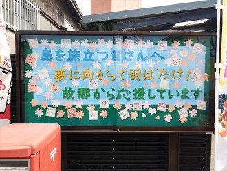 沖永良部島内の各郵便局で3月下旬頃まで、同島の中学や高校の卒業生らが進学や就職で島を離れる「島立ち」の時期に合わせ、旅立つ若者へ向けた応援メッセージが掲出された。知名郵便局や国頭郵便局などの出入り口付近には、「夢に向かって羽ばたけ!」などの温かい言葉が飾られた。