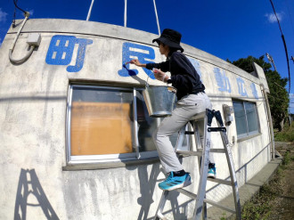 沖永良部島の和泊町民運動広場(和泊町内城)で12月5日、同町教育委員会に勤める和田なおみさんと中田仁さんが倉庫の壁の塗り替え作業を行った。