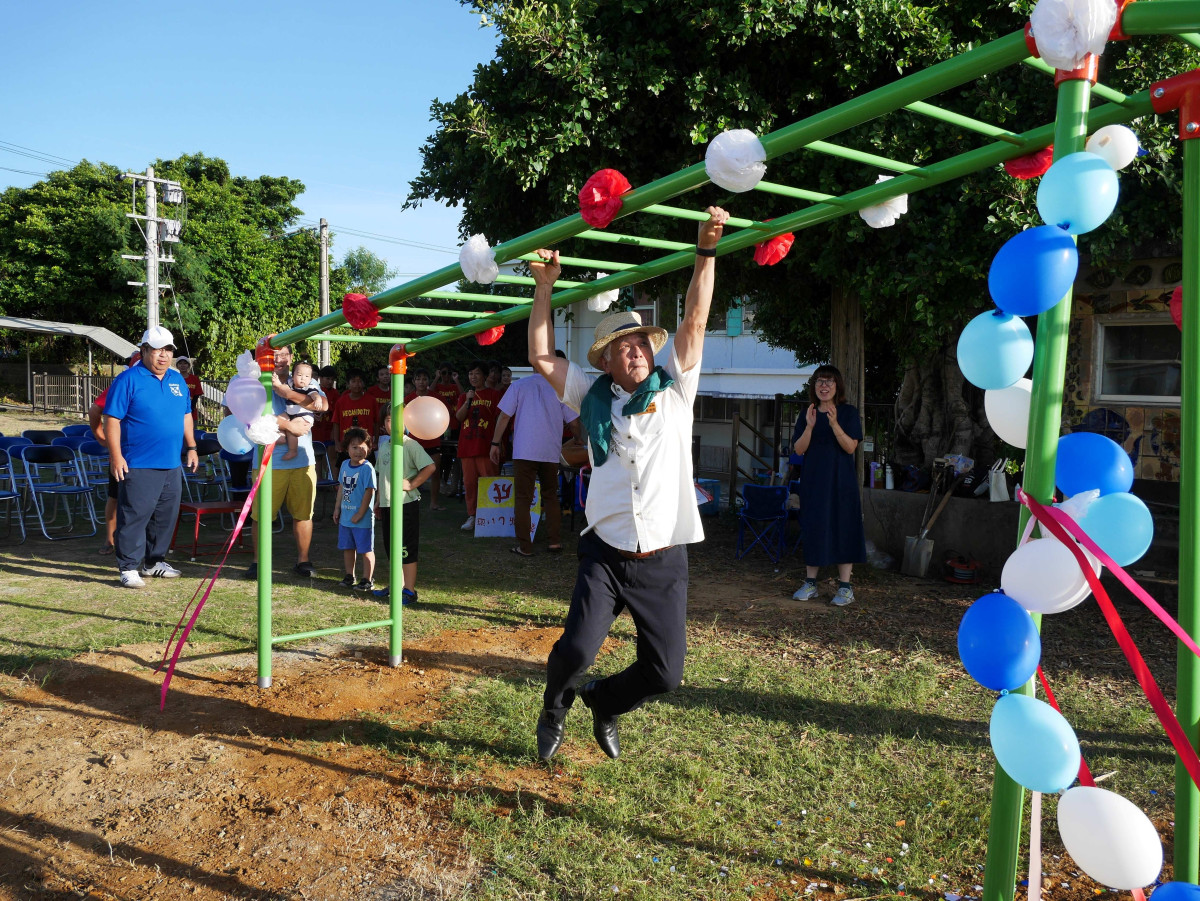 与論町の茶花小学校(与論町茶花)で9月6日、昨年度の卒業生らが記念品として寄贈した遊具の落成式が開かれた。