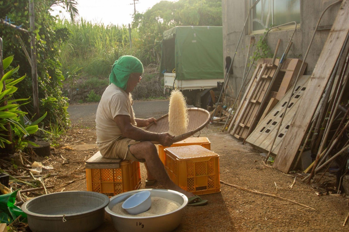 沖永良部島和泊町の国頭字に住む橋口盛一さんが9月29日、自身の倉庫で今年収穫した米を精米した。