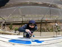 沖永良部島の和泊町民運動広場(和泊町内城)で12月5日、同町教育委員会に勤める和田なおみさんと中田仁さんが倉庫の壁の塗り替え作業を行った。