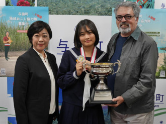 与論中学校3年の吉岡ブワジョル愛実衣(えみい)さんとその家族、担当教諭らが12月5日、与論町役場(与論町茶花)に田畑克夫町長、中山義和教育長を表敬訪問し、高円宮杯第77回全日本中学校英語弁論大会の2位入賞とオーストラリア大使館賞の受賞を報告した。