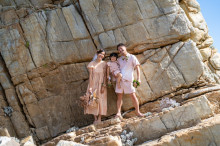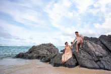徳之島の弁当販売店「ネリヤカナ屋」(徳之島町亀津)が展開する月桃染めの衣料ブランド「月桃獅子徳之島」のウエディング衣装が10月19日、島内で行われたフォトウエディングに初めて貸し出された。
