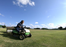 皆が使えるようにと芝生を整える同町教育委員会の名越次長