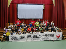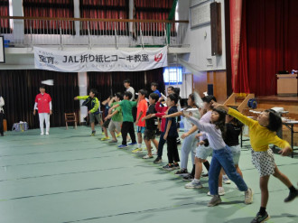 与論小学校(与論町朝戸)で12月13日、創立150周年式典に合わせ「JAL航空教室、折り紙ヒコーキ教室」が開かれた。