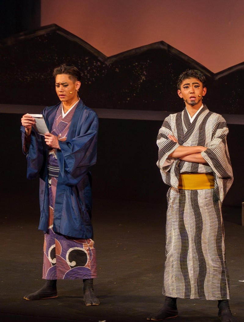 薩摩藩士西郷隆盛とのやり取りを表現するシーン。島口指導の元、流ちょうな島口セリフも交えられた(写真提供=結シアター手舞)