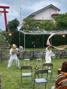 与論島の劇団「野生の島人」が3月25日、地主・琴平神社(与論町立長)境内で、武蔵野美術大学教授でファッションデザイナーの津村耕佑さんをゲストに迎え、ファッションと空間の関わりや島の精神性をテーマにしたパフォーマンスとトークセッションを行った。