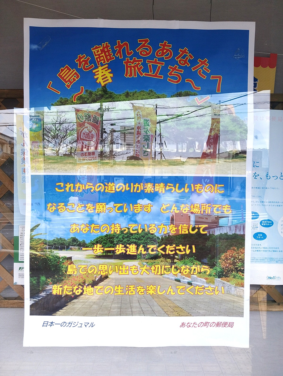 沖永良部島内の各郵便局で3月下旬頃まで、同島の中学や高校の卒業生らが進学や就職で島を離れる「島立ち」の時期に合わせ、旅立つ若者へ向けた応援メッセージが掲出された。