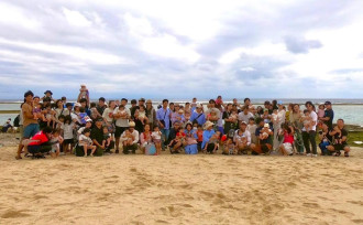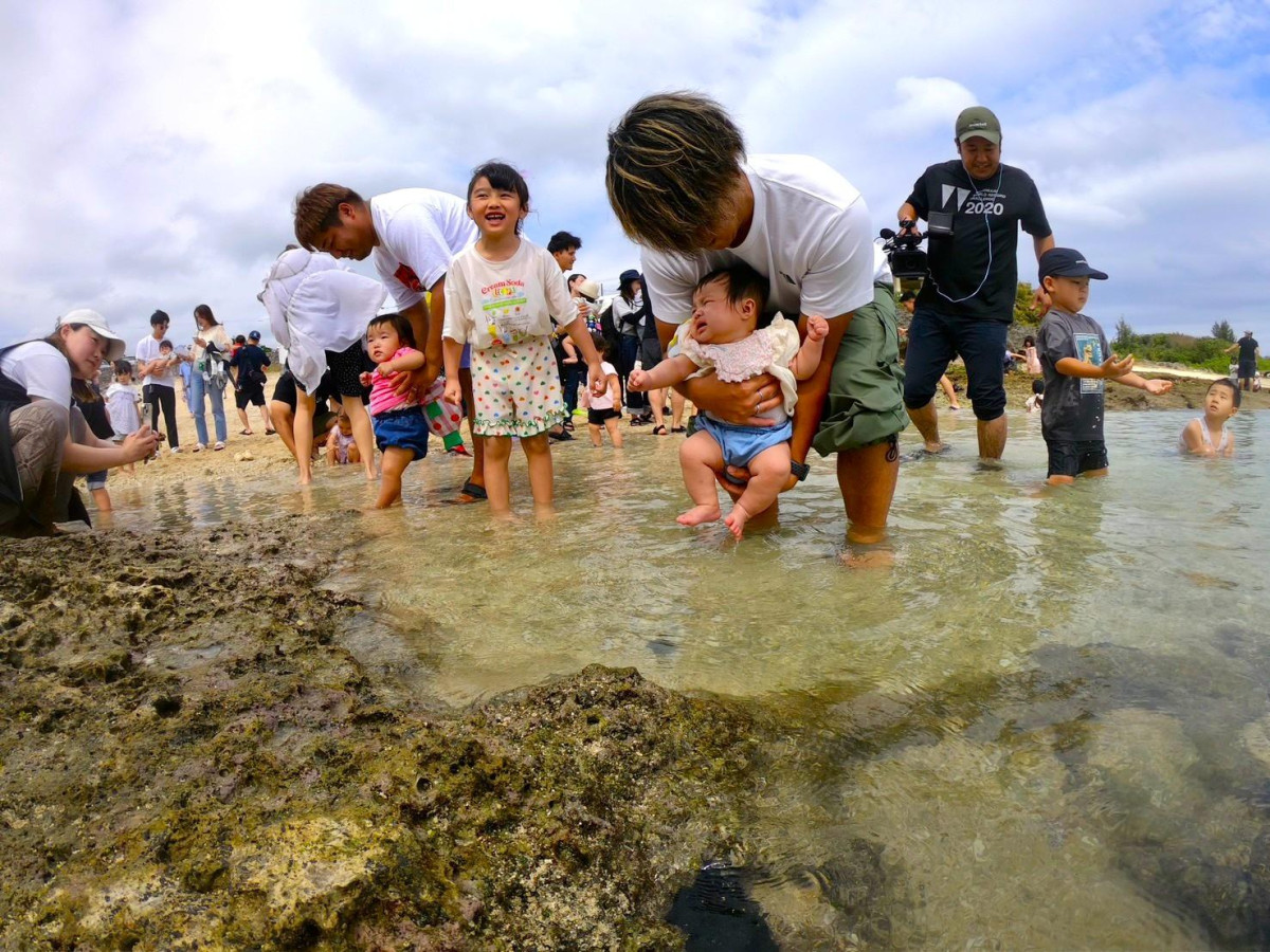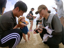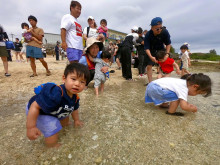 沖永良部島の屋子母ビーチ(知名町屋子母)で4月19日、海開きの神事と奄美の伝統行事「浜下り(はまおり)」が行われ、0歳~1歳の子どもを連れた50以上の家族が参加した。