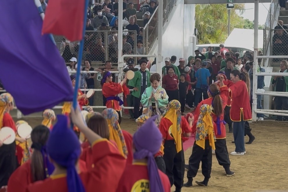 徳之島闘牛太鼓の太鼓とかけ声で入場する三沢さん